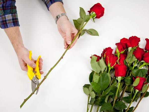 Sử dụng kéo hoặc dao thật sắc để cắt cành hoa, cắt chéo cành khoảng 45o để tăng diện tích tiếp xúc với nước. Cắt một cách dứt khoát, tránh làm cành hoa bị dập, không hút nước được làm hoa héo nhanh hơn.